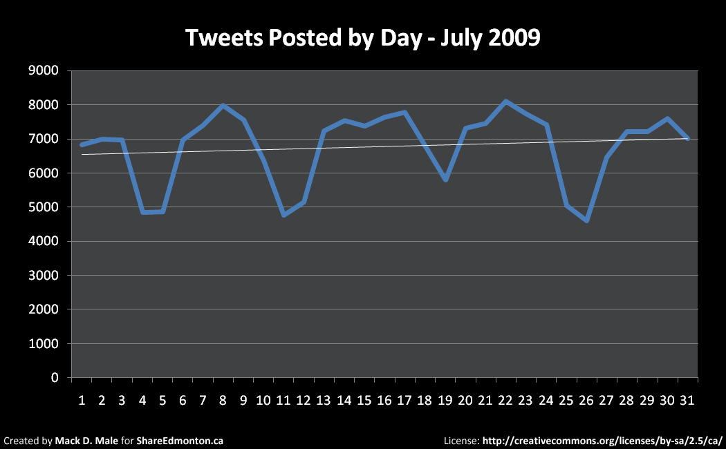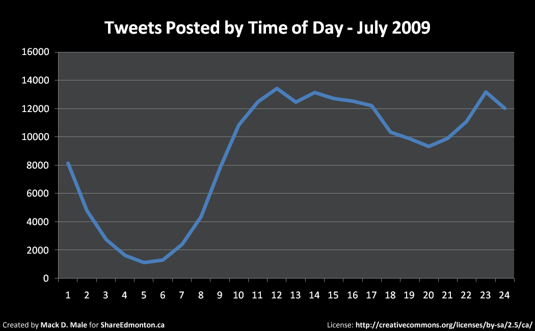 To clarify, that means there were 5133 users who posted at least one tweet in July 2009 with their location set to something that makes them an Edmontonian as described above. This number should be treated as a minimum – there are probably many more Edmonton users without their location set.