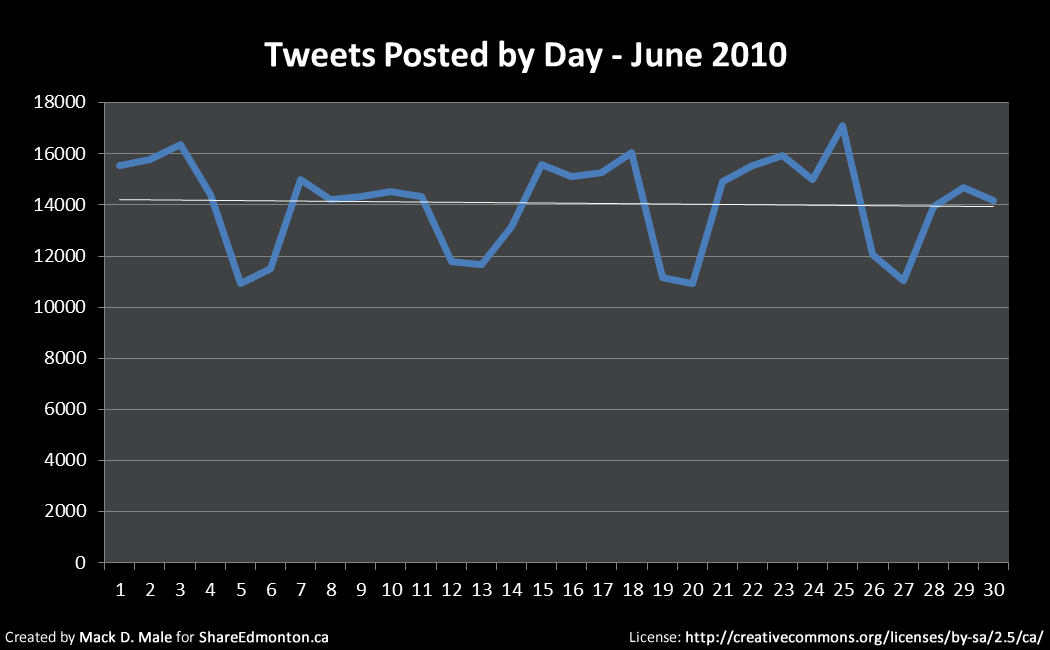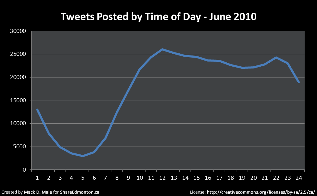 There was a slight increase in the number of users in June, and a slight decrease in the number of tweets posted. I think that decrease is due to two things: one less day than in May, and the large amount of downtime that Twitter experienced in June (it was their worst month since August 2009). I’ll have more on this in a future post, but June 20 was the second anniversary of the #yeg hashtag!